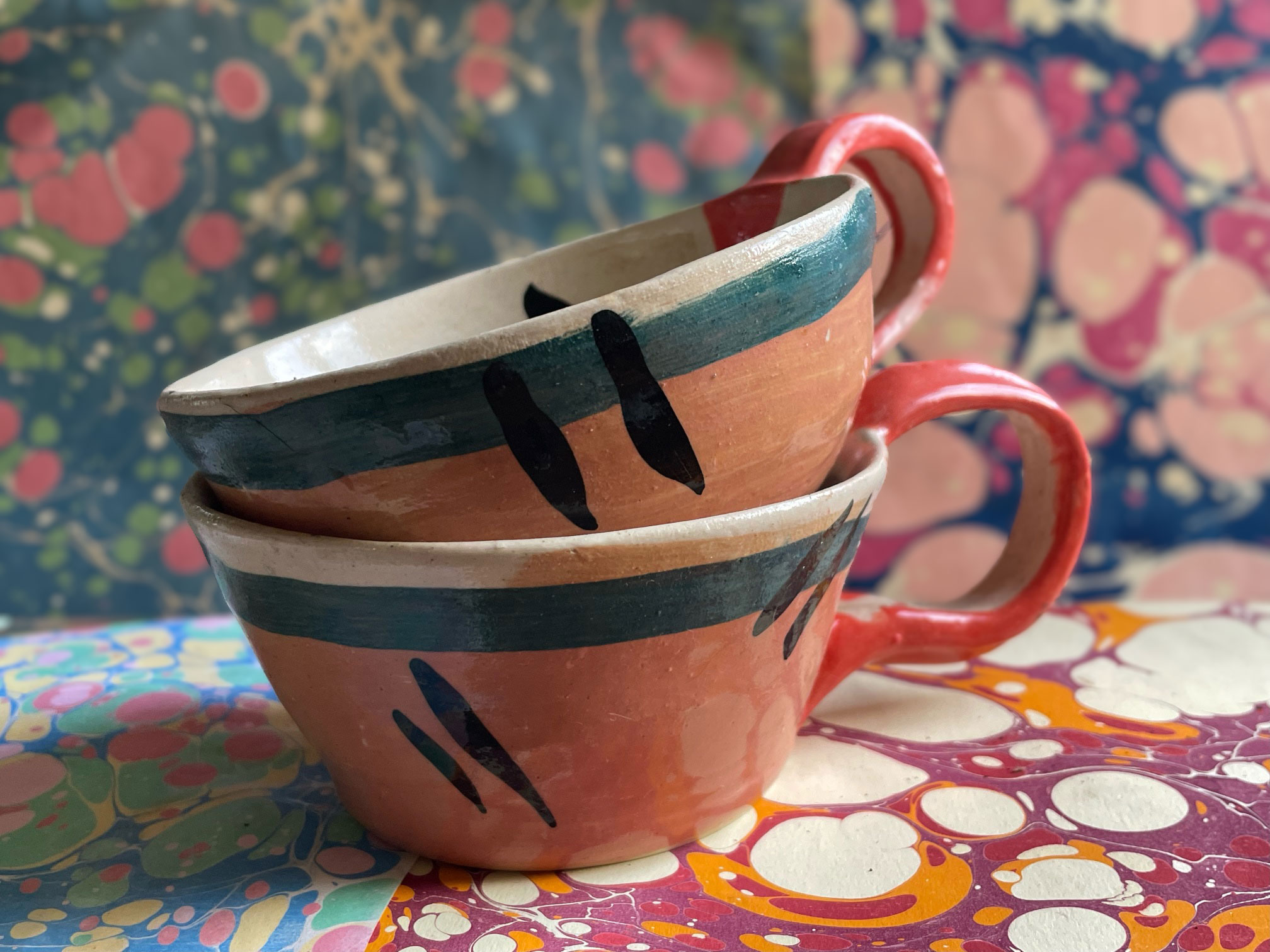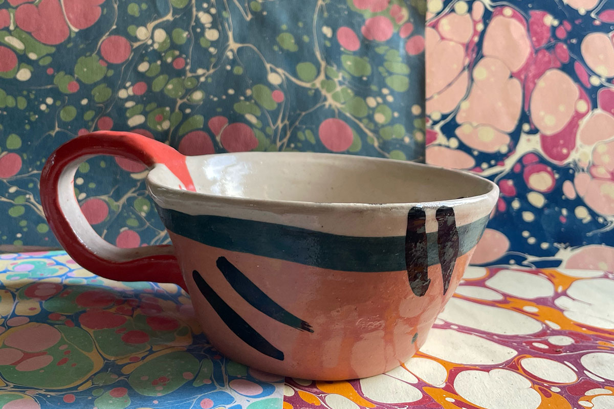 Clara Hazleton is a ceramic artist and a surface pattern artist who loves vibrant colour. She is currently focussing on the technique of marbling and uses bright colours for her effects.