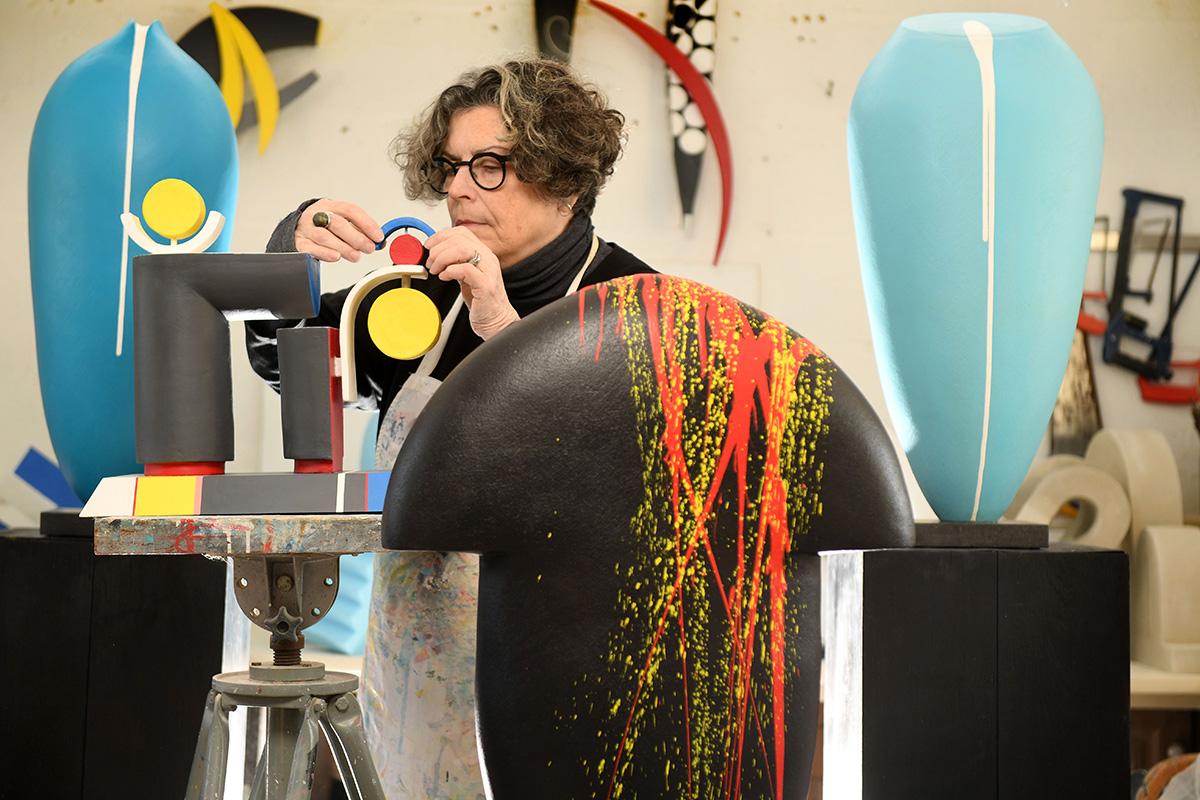 Patricia Volk is a Fellow of the Royal Society of Sculptors (FRSS), West of England Academician (RWA) & Member of Bath Society of Artists. Her sculptures in painted clay are playfully abstract and instinctive. Their language is one of contradictions and juxtapositions of form, line, and often vibrant colour.